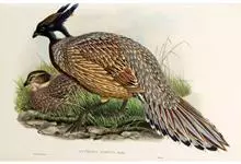 血雉雉科血雉属鸟类,别名血鸡、松花鸡,血雉的雄鸟大覆羽、尾下覆羽、尾上覆羽、脚、头侧、腊膜为红色,故称血雉。其别名甚多,各地皆异。在甘肃,因其胸侧和翅上覆羽沾绿,被称为“绿鸡”;因其羽毛形似柳叶,…全部>>