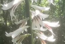 大百合 Makino)是百合科大百合属的多年生草本植物。小鳞茎卵形;叶纸质,网状脉,基生叶卵状心形或宽,茎生叶卵状心形;总状花序,花狭喇叭形,内具淡紫红色条纹,花丝向下渐扩大,子房圆柱形;蒴果近球形,…全部>>