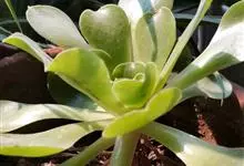 红缘莲花掌属蔷薇目、景天科植物,原产大西洋的加那利群岛。质厚,蓝绿色,被白霜,叶缘红褐色。聚伞花序,花浅黄色,有时带红晕。叶形叶色较美,有一定的观赏价值,多盆栽用于点缀室内;可放置于电视、电脑旁,…全部>>