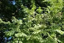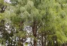 落羽杉 Rich.),杉科落羽杉属木本植物。树干尖削度大,基部通常膨大,具膝状呼吸根,树皮棕色,裂成长条片;一年生小枝褐色,侧生短枝;叶线形;球果具短柄,熟时淡褐黄色,被白粉;花期3月;球果10月成熟。…全部>>