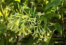 夜香树是茄科、夜香树属直立或近攀援状灌木。枝条细长而下垂。叶有短柄,叶片矩圆状卵形或矩圆状披针形,全缘,顶端渐尖,基部近圆形或宽楔形,两面秃净而发亮,有6-7对侧脉。伞房式聚伞花序,腋生或顶生,…全部>>