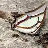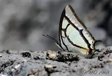 大二尾蛱蝶两翅正面黑色,中域有一浅绿色大型宽带纹,两翅反面浅绿色,中域有一缀黑边的褐色弧纹,亚外缘还有一深褐色横纹,后翅各有尾突两条,…全部>>