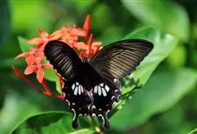 玉斑凤蝶Papilio helenus 别名白纹凤蝶,是凤蝶科凤蝶属美凤蝶亚属大型种类。雌雄同型;体翅皆黑色,后翅正面中室外有3个并列的白色斑,亚外缘有1列模糊的新月形红色斑,…全部>>