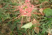 石蒜[学名:Lycoris radiata Herb.],是石蒜科石蒜属的多年生草本植物,别名彼岸花、红花石蒜、死人花、蟑螂花、龙爪花等。石蒜的叶狭带状,中间有粉绿色带,秋季出叶。伞形花序,花鲜红色。…全部>>