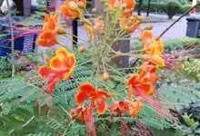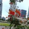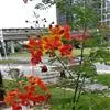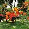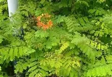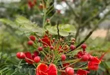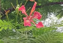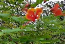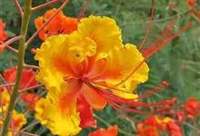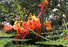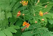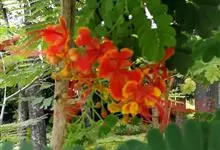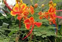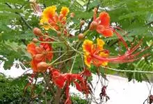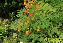 洋金凤 Sw.),豆科小凤花属灌木状或小乔木植物,枝无毛,绿或粉绿色;二回羽状复叶;总状花序伞房状,萼片无毛,花瓣橙红或黄色,圆形,花丝红色,子房无毛,花柱橙黄色;荚果窄而薄,…全部>>