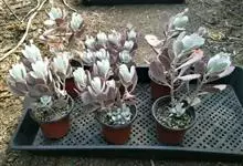 江户紫,景天科伽蓝菜属草本植物,是多年生草本花卉。花白色,但栽培中很少能见到花,常作观叶植物栽培。…全部>>