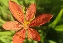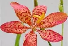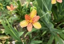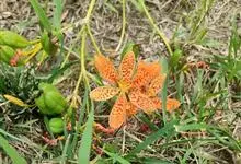 射干 Redouté)是鸢尾科射干属多年生草本植物。根状茎为不规则的块状,斜黄色或黄褐色;花橙红色,散生紫褐色的斑点;花药呈条形;子房下位,倒卵形;蒴果倒卵形或长椭圆形;种子圆球形,黑紫色,有光泽。…全部>>