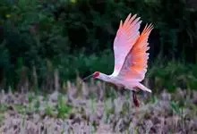 粉红琵鹭:体高87厘米,翼展127厘米,体重1300克,寿命10年。是一种大型涉禽。脚很长,喙长而呈竹片状。成鸟头部光秃及呈绿色,颈部、背部及胸部呈白色,其他的都呈深粉红色。喙呈灰色。雄鸟和雌鸟相似…全部>>
