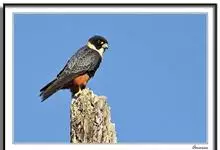 燕隼:是隼科、隼属的鸟类。体长约36厘米,体重140-340克。体形比猎隼、游隼等都小,为小型猛禽,雌鸟比雄鸟稍大;头部和颈后主要为灰黑色,颈后有一乳白色领斑;上体其余部分羽毛灰色,尾部稍淡,…全部>>