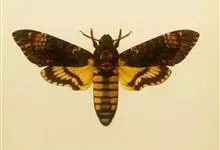 鬼脸天蛾,是鳞翅目天蛾科面形天蛾属动物。成虫翅展100~125毫米,体黑褐色;胸背有骷髅形斑纹;卵圆球形,直径约2毫米,淡黄绿色,表面光滑;老熟幼虫体长70~90毫米,蛹体长约56毫米;前翅为褐色,…全部>>