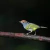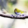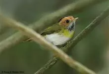 棕脸鹟莺:体长10厘米,是一种色彩亮丽而有特色的莺鸟。头栗色,具黑色侧冠纹。上体绿,腰黄色。下体白,颏及喉杂黑色点斑,上胸沾黄。与栗头鹟莺的区别在头侧栗色,白色眼圈不显著且无翼斑。…全部>>