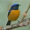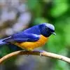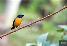 棕腹大仙鹟:体重24-28克,体长15-17厘米,是一种小型的色彩亮丽的鹟。雄鸟上体深蓝,下体棕色,脸黑,额、颈侧小块斑、翼角及腰部亮丽闪辉蓝色。与棕腹仙鹟易混淆,区别在色彩较暗。雌鸟灰褐,…全部>>