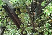 大果榕是桑科榕属的小乔木,株高可达10米;幼枝被柔毛;叶互生,宽卵状心形或近圆形;雄花无梗、匙形、花丝长,雌花生于雌株榕果内,子房白色;榕果簇生于树干基部或老茎短枝上、扁球形或陀螺形,…全部>>