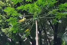 番木瓜,番木瓜科番木瓜属的常绿软木质小乔木,高达10米,具有乳汁;茎不分枝或有时于损伤处分枝;叶大且聚生于茎顶,近似盾形,叶柄中空;花单性或两性,有些品种雄株偶尔生两性花或雌花,…全部>>