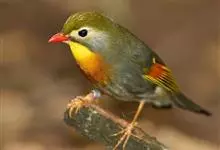 银耳相思鸟小型鸟类,体长14~18厘米。头顶黑色,耳羽银灰色,前额橙黄色;外侧飞羽橙黄色,基部朱红色,极为鲜艳、醒目。尾圆形,尾上、尾下覆羽朱红色,尾暗灰褐色,外侧尾羽橙黄色,其余上体橄榄绿或橄榄黄色。…全部>>