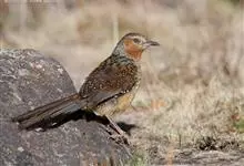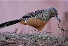 大噪鹛:中型鸟类,体长32-36厘米。额至头顶黑褐色,背栗褐色满杂以白色斑点,斑点前缘或四周还围有黑色。初级覆羽、大覆羽和初级飞羽具白色端斑。尾特长,均具黑色亚端斑和白色端斑。颏、喉棕褐色,…全部>>