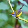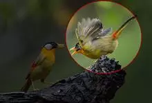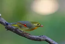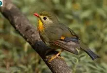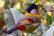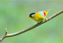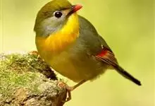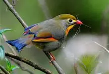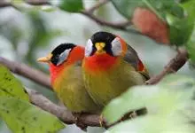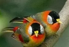 银耳相思鸟小型鸟类,体长14~18厘米。头顶黑色,耳羽银灰色,前额橙黄色;外侧飞羽橙黄色,基部朱红色,极为鲜艳、醒目。尾圆形,尾上、尾下覆羽朱红色,尾暗灰褐色,外侧尾羽橙黄色,其余上体橄榄绿或橄榄黄色。…全部>>