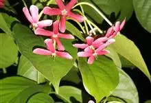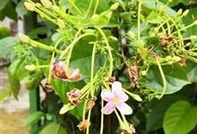 使君子 Jongkind)是使君子科、使君子属攀援灌木,叶对生,椭圆形,两面均被灰白色柔毛。穗状花序,倒挂下垂。花期夏秋。果有五棱,熟时黑色,种子白色。分布于印度、缅甸、菲律宾和中国。喜温润,深根性,…全部>>