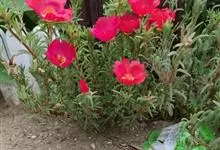 大花马齿苋:一年生草本,高10-30厘米。茎平卧或斜升,紫红色,多分枝,节上丛生毛。叶密集枝端,较下的叶不规则互生,叶片细圆柱形,无毛。花单生或数朵簇生枝端,直径2.5-4厘米,…全部>>