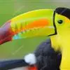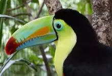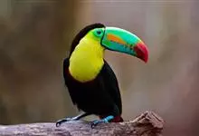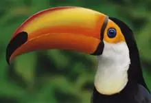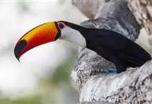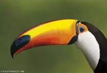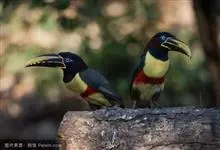 鵎鵼:又名巨嘴鸟。体长约67厘米,嘴巨大,长17~24厘米,宽5~9厘米,形似嘴刀。嘴非常漂亮,上半部黄色,略呈淡绿色,下半部呈蔚蓝色,喙尖点缀着一点殷红。眼睛四周镶嵌着天蓝色羽毛眼圈,胸脯橙黄色,…全部>>