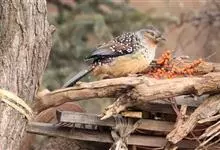 大噪鹛:中型鸟类,体长32-36厘米。额至头顶黑褐色,背栗褐色满杂以白色斑点,斑点前缘或四周还围有黑色。初级覆羽、大覆羽和初级飞羽具白色端斑。尾特长,均具黑色亚端斑和白色端斑。颏、喉棕褐色,…全部>>