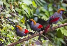 赤尾噪鹛中型鸟类,体长24~28厘米。头顶至后颈红棕色,两翅和尾鲜红色,眼先、眉纹、颊、颏和喉黑色,眼后有一灰色块斑。其余上下体羽大都暗灰或橄榄灰色。特征极明显,特别是通过鲜红色的头顶、翅和尾。…全部>>