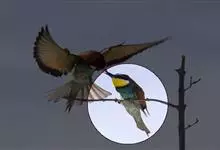 栗喉蜂虎是蜂虎科蜂虎属的鸟类。有热带鸟类羽毛艳丽的特征:喉部是栗红色的,黑色的过眼纹,翅膀和背部是绿色的,尾翼是蓝色的,飞行时翅膀下面的羽毛是橙黄色的,在阳光的照射下,它们全身闪烁着金属般的艳丽光泽,…全部>>