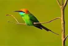 绿喉蜂虎是佛法僧目、蜂虎科的小型鸟类,共有9个亚种。身长22-25厘米,翼展29-30厘米,体重15-20克。喉绿色,额部、头顶至上背为锈红色,其余上体均为亮绿色。中央尾羽延长且端段狭细,…全部>>