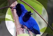 蓝翅叶鹎:小型鸟类,体长15-18厘米。雄鸟通体草绿色,尾蓝绿色,肩和翅亮蓝 色,胸缀有黄色,颏、喉黑色。雌鸟颏,喉蓝绿色。栖息在海拔1500米以下的常绿阔叶林、次生林和林缘疏林灌丛中。…全部>>