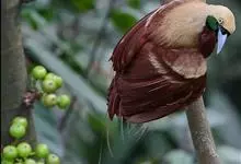 大极乐鸟是极乐鸟属中最大的鸟种。成年雄鸟体长可达到43厘米,雌性可达35厘米。雄鸟的额、颊、喉等墨绿色;头、颈黄色;上体暗赤栗色;腹部葡萄红色,胁部有长饰羽,其基部橙黄,中部黄色,…全部>>