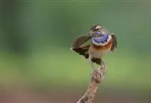 蓝点颏亦称“蓝喉歌鸲”,通称蓝靛颏儿。身体大小和麻雀相似,体长12-13厘米,体重17-18克。头部、上体主要为土褐色。眉纹白色。尾羽黑褐色,基部栗红色。颏部、喉部辉蓝色,下面有黑色横纹。下体白色。…全部>>