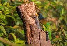 绿拟啄木鸟为鴷形目,须科,拟啄木属的一种。形较大拟啄木鸟略小,体长约260mm。头、颈及胸浅褐而具淡黄白色条纹;喉几为淡黄白色;身体余部草绿色。虹膜棕褐色,眼周裸露部黄色;嘴峰角黄色;跗跖和趾角黄…全部>>