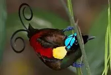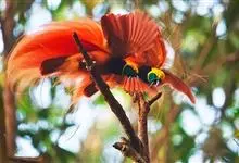 大极乐鸟是极乐鸟属中最大的鸟种。成年雄鸟体长可达到43厘米,雌性可达35厘米。雄鸟的额、颊、喉等墨绿色;头、颈黄色;上体暗赤栗色;腹部葡萄红色,胁部有长饰羽,其基部橙黄,中部黄色,…全部>>