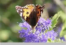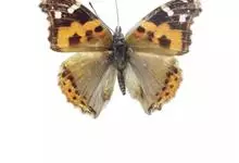 大红蛱蝶Vanessa indica Herbst,翅黑褐色,外缘波状。前翅M1脉外伸成角状,翅顶角有几个白色小点,亚顶角斜列4个白斑,…全部>>