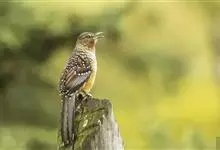 大噪鹛:中型鸟类,体长32-36厘米。额至头顶黑褐色,背栗褐色满杂以白色斑点,斑点前缘或四周还围有黑色。初级覆羽、大覆羽和初级飞羽具白色端斑。尾特长,均具黑色亚端斑和白色端斑。颏、喉棕褐色,…全部>>