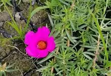 大花马齿苋:一年生草本,高10-30厘米。茎平卧或斜升,紫红色,多分枝,节上丛生毛。叶密集枝端,较下的叶不规则互生,叶片细圆柱形,无毛。花单生或数朵簇生枝端,直径2.5-4厘米,…全部>>