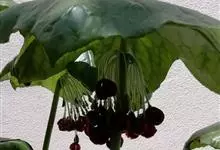 八角莲 M. Cheng)小檗科鬼臼属的多年生草本。植株高40~150厘米;根状茎直立,不分枝,无毛,淡绿色;叶互生,薄纸质,呈盾状,叶脉明显隆起,边缘有细齿;花深红色,5~8朵簇生于叶下方,下垂,…全部>>