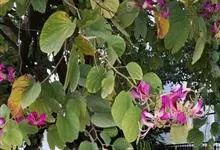 羊蹄甲,别名紫花羊蹄甲、玲甲花,是豆科羊蹄甲属的一种常绿乔木或灌木。树冠开展,枝桠低垂;树皮灰色至暗褐色,近光滑。枝幼时微被灰色短柔毛,后毛脱落;叶硬纸质,近圆形,基部浅心形,…全部>>