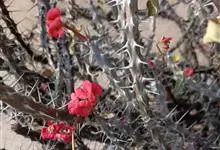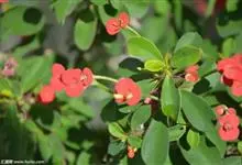 虎刺梅:别称铁海棠,是蔓生灌木植物。茎多分枝,长60-100厘米,直径5-10毫米,具纵棱,密生硬而尖的锥状刺,刺长1-1.5厘米,直径0.5-1.0 毫米,常呈3-5列排列于棱脊上,呈旋转。叶互生…全部>>