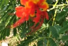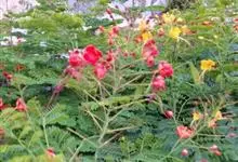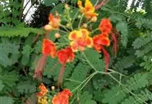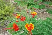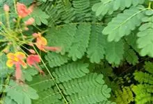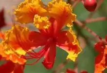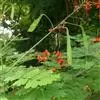洋金凤 Sw.),豆科小凤花属灌木状或小乔木植物,枝无毛,绿或粉绿色;二回羽状复叶;总状花序伞房状,萼片无毛,花瓣橙红或黄色,圆形,花丝红色,子房无毛,花柱橙黄色;荚果窄而薄,…全部>>