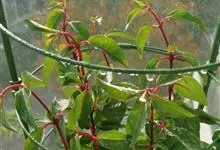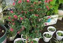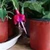 倒挂金钟是柳叶菜科倒挂金钟属亚灌木植物。茎直立,多分枝;幼枝带红色,被短柔毛与腺毛,老时渐无毛;叶对生,卵形或窄卵形,脉常带红色;常带红色,被短柔毛与腺毛;花筒红色,筒状钟形,…全部>>