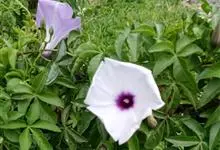 五爪金龙 Sweet),旋花科番薯属多年生缠绕草本植物。茎细长,有细棱;叶片为掌状;花冠紫红色、紫色或淡红色、偶有白色,漏斗状;蒴果近球形。花期5~12月。五爪金龙的叶子类似掌状,有5至7个裂痕,…全部>>