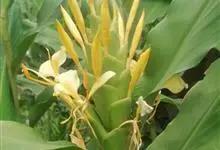 黄姜花:姜科,姜花属多年生草本草本芳香花卉,秋冬季开花,穗状花序,长圆形;苞片长椭圆形,覆瓦状排列,每一苞片内有花3-5朵;花深黄色,形似蝴蝶,气味芬芳纯正,沁人心脾;唇瓣倒心形,黄色,…全部>>