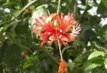 吊灯扶桑 Hook. f.)为锦葵科木槿属的常绿灌木。高达3米;小枝常下垂;叶椭圆形或长圆形,先端尖或短渐尖,基部楔形;花梗细,无毛或具纤毛,中部具节;蒴果长圆柱形;花期全年。因似灯笼高挂,…全部>>