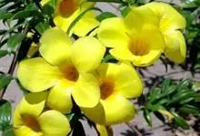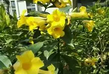 大花软枝黄蝉是软枝黄蝉的一个变种,夹竹桃科黄蝉属植物。藤状灌木,长达4米,枝条软弯垂,具白色乳汁。叶纸质,椭圆形、卵圆形或倒卵形,花序着花4-5朵,花冠比原变种大形,橙黄色,花冠喉部具5个发亮的斑点…全部>>