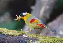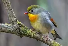 银耳相思鸟小型鸟类,体长14~18厘米。头顶黑色,耳羽银灰色,前额橙黄色;外侧飞羽橙黄色,基部朱红色,极为鲜艳、醒目。尾圆形,尾上、尾下覆羽朱红色,尾暗灰褐色,外侧尾羽橙黄色,其余上体橄榄绿或橄榄黄色。…全部>>