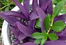 紫竹梅 D. R. Hunt),鸭跖草科紫露草属植物的多年生草本植物,茎多分枝,带肉质,紫红色,节上常生须根,上部近于直立;叶互生,披针形,先端渐尖,基部抱茎而成鞘,鞘口有白色长睫毛,上面暗绿色,…全部>>