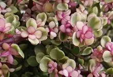 雅乐之舞是马齿苋科马齿苋属多年生肉质灌木植物。植株较矮,株高3~4米;水平分枝,枝干较细;茎肉质,老茎灰白色,新茎红褐色;叶片肉质,黄白色倒卵形,中间为淡绿色新叶,叶缘还带有粉红色;开淡粉色小花,…全部>>