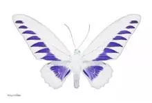 天堂凤蝶翅展可达105mm。前、后翅自基角至后缘约1/2~2/3端为纯净的宝蓝色,后角至后缘1/3~1/2端为黑色,后翅有黑色的尾突。翅背面为棕褐色。全部>>