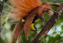 大极乐鸟是极乐鸟属中最大的鸟种。成年雄鸟体长可达到43厘米,雌性可达35厘米。雄鸟的额、颊、喉等墨绿色;头、颈黄色;上体暗赤栗色;腹部葡萄红色,胁部有长饰羽,其基部橙黄,中部黄色,…全部>>